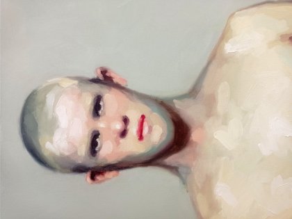 Obra de gran formato perteneciente al proyecto Llévame a bailar (2020-2023). Éste nace de experiencias personales, tratando el acto de salir a bailar como ritual identitario: una forma de búsqueda de uno mismo a través de distintos lugares, personas y vivencias. En la composición aparecen cuatro figuras unidas en posición horizontal, lo que podría sugerir un movimiento acuático. Sin embargo, la imagen alude a un recuerdo muy concreto: el interior del baño de una discoteca completamente forrado de espejos. Los múltiples ángulos y reflejos generaban curiosas repeticiones visuales de los cuerpos, un efecto óptico hipnótico que se convertía en un inesperado entretenimiento durante momentos de espera. Idea que entronca con la propuesta de FLUXU 2025: la percepción de lo fragmentario.
