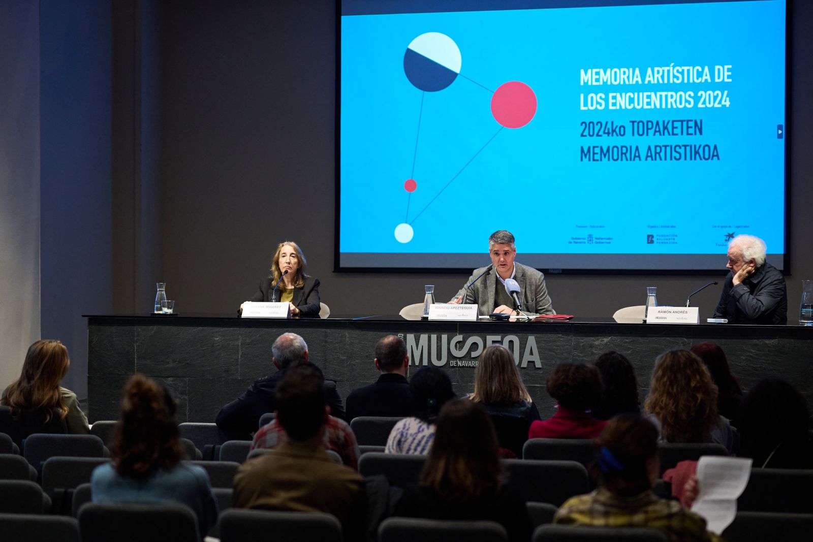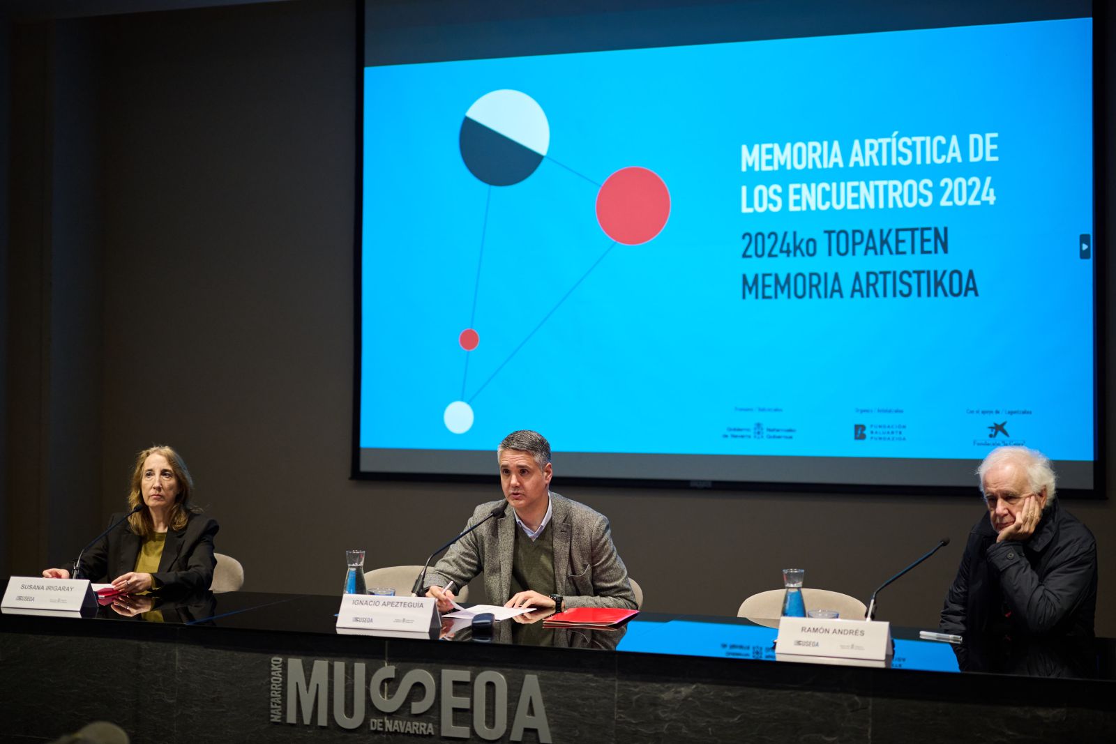 Con el objetivo de “estimular la interrelación entre la creación artística y la sociedad” a partir de las vivencias y reflexiones generadas por la bienal Encuentros de Pamplona 2024/ Iruñeko Topaketak, la iniciativa promovida por Gobierno de Navarra y Fundación Baluarte y que cuenta con la colaboración de Fundación “la Caixa” ha sido presentada hoy en el Museo de Navarra en una rueda de prensa en la que han tomado parte Ignacio Apezteguía, director general de Cultura-Institución Príncipe de Viana del Gobierno de Navarra, Ramón Andrés, comisario del programa de los Encuentros, y Susana Irigaray, directora del Servicio de Museos del Gobierno de Navarra, junto con las y los artistas que los llevarán a cabo.
