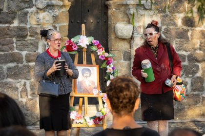 Milagros eta Valentina elkarrekin egon dira bizitza osoan, eta orain alargunduta ere elkarrekin daude. Duela gutxi hil ziren haien senarrak, eta, azken borondate gisa, beren agurra espazio honetan izatea nahi izan dute. Eta emakumeak, beti arduratsu izanda, hemen agertzen dira, agurra erabat prestatuta, baina beraiek nahi duten moduan aterako al da? Orain, garaia da libre eta bakean hegan egiteko… Herriko plazak, inoiz baino gehiago, zeresana emango du. Milagrosek eta Valentinak bizitza osoan ezagutzen dute Txistu-talde tradizional gisa sortu ginen, egun batean instrumentu horri aukera ematea erabaki genuelako. Musika duela mende askotatik hona globala dela eta folkloreen sustraiak historian batu eta elkartzen direla pentsatuz, Musika Errenazentistaren kontzertu baterako errepertorioa sortu genuen 2021ean. Hortik aurrera, urtero aldatzen dugu errepertorioa: “Soinu-bandak” 2022an, “Munduko musikak” 2023an. 2025eko kontzerturako izenburuak “Munduko musikak” elkar, edo hori uste dute. Zeregin komun bat duten bi emakume: hildako senarren azken borondatea betetzea; hau da, errautsak botatzea… Emakumeak lagunak dira, senarrak lagun minak ziren. Lorena Arangoa eta Aintzane Baleztena, ibilbide luzeko bi pailazo, lehen aldiz elkartu dira ikuskizun hau sortu eta horrekin gozatzeko. “Milagros eta Valentina” ikuskizun komiko eta dibertigarria da, eta publikoak gozatu ahal izango du bertako pena, eztabaida, despiste, poz eta abarrekin.